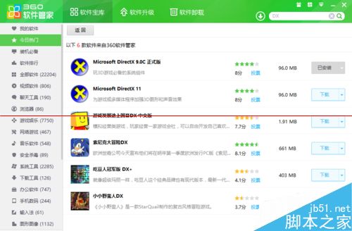 4、在360软件管家或其他卫士的软件管家搜索DX一键安装DirectX 9.0c正式版(因为我的电脑安装过了所以显示已安装,做还这些之后就可以撸了!