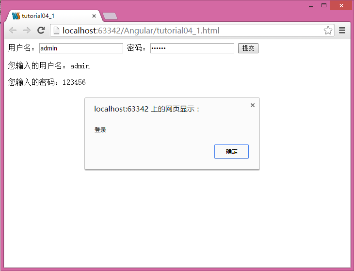 我们有登录页面tutorial04_1.html和修改密码页面tutorial04_2.html,控制器代码都写在tutorial04.js中,在这两个页面中都定义了相同的控制器UserController。