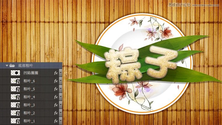 现在光秃秃的怎么行,粽子当然是用粽叶包起来的,导入“粽叶”素材,然后在两个文字图层的下方新建图层组并命名为“底部粽叶”,然后将粽叶排列到文字的底部。为了做出盘子凹陷感,在上方在新建一个正圆形,填充改为“0”,然后图层样式勾选内阴影,适当调整颜色以及不透明度。
