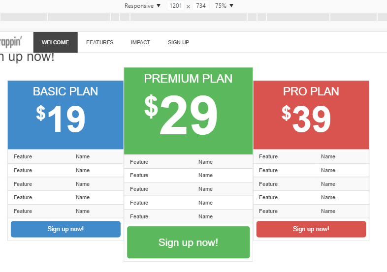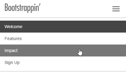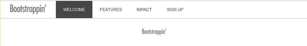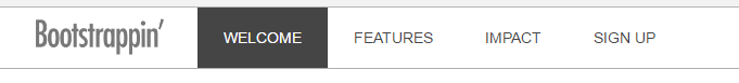 <header role="banner"> <nav role="navigation" class="navbar navbar-default navbar-fixed-top"> <div class="container"> <div class="navbar-header"> <button type="button" class="navbar-toggle" data-toggle="collapse" data-target=".navbar-collapse"> <span class="icon-bar"></span> <span class="icon-bar"></span> <span class="icon-bar"></span> </button> <a class="navbar-brand" href="index.html"><img src="img/logo.png" alt="Bootstrappin'" width="120"></a> </div> <div class="navbar-collapse collapse"> <ul class="nav navbar-nav"> <li class="active"><a href="#welcome">Welcome</a></li> <li><a href="#features">Features</a></li> <li><a href="#impact">Impact</a></li> <li><a href="#signup">Sign Up</a></li> </ul> </div> <!--/.nav-collapse --> </div> <!--/.container --> </nav> </header>