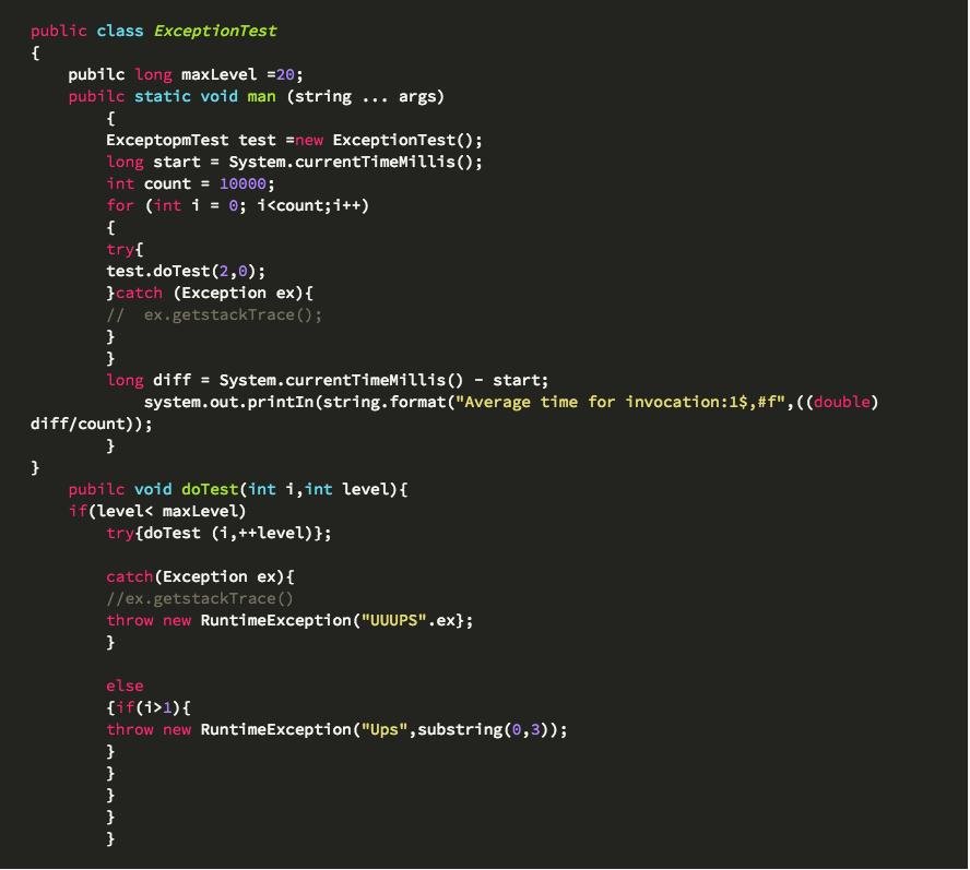 我的实验基于一段随机抛出异常的简单代码。从科学的角度,这并非完全准确的测量,同时我也并不了解HotSpot 编译器会对运行中的代码做何动作。但无论如何,这段代码应该能够让我们了解一些基本情况。