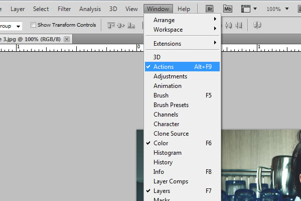 一、首先,打开你的图片。在菜单“窗口”选项,单击“动作(Alt + F9)打开动作面板。