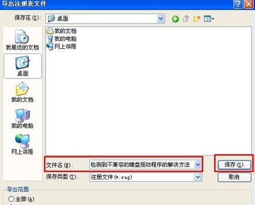 5.选择要导出注册表文件的位置,并在文件名框中输入任意名称,单击“保存”按钮