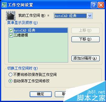 2、首先输入命令:【CUI 】之后在--自定义--工作空间--右键点击“AutoCAD经典”选择设定默认。