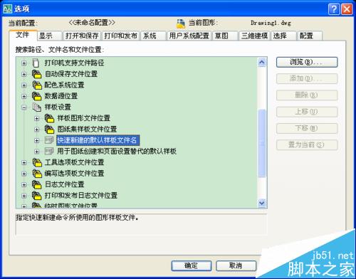 5、接着 样板设置”---“快速新建的默认样板文件名”浏览指定到“acadiso.dwt”