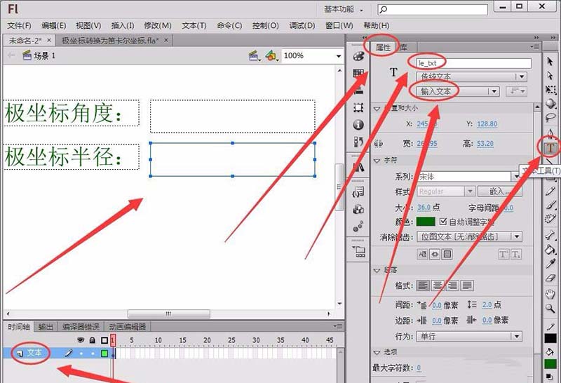 1、选择“编辑栏”中的“文本工具”,在舞台绘制两个输入文本框,在属性面板中将“实例名称”取名为“ra_txt”和“le_txt”。(注:要嵌入字体)