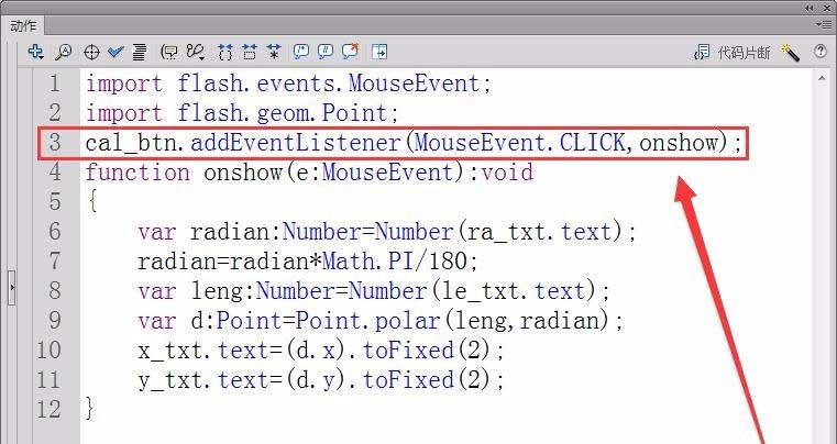 4、新建一个代码图层,打开“动作”面板。首先,注册按钮cal_btn鼠标单击事件的侦听器,接收者函数为onshow。