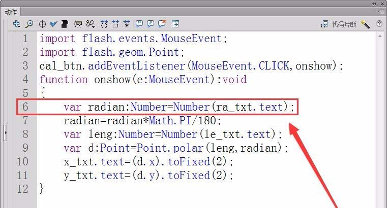 6、定义一个实型变量,用来存储输入的角度值,用ra_txt.text属性获取舞台上输入的角度值。