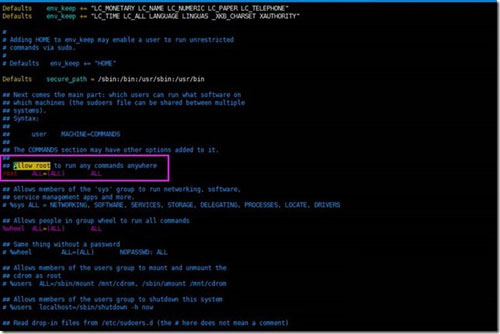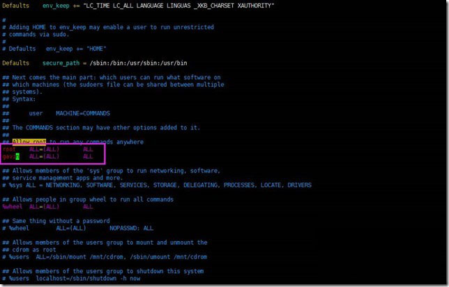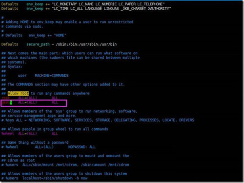找到##Allow root to run any command anywhere一行,然后会有root ALL=(ALL) ALL的信息;