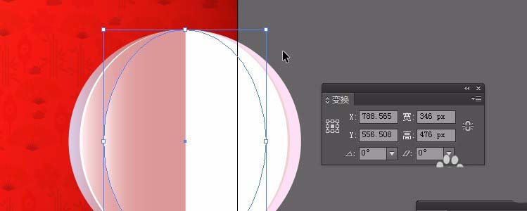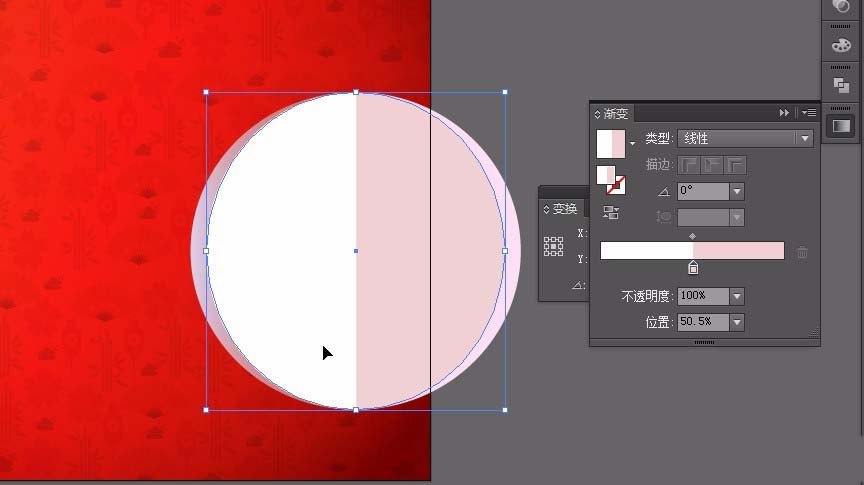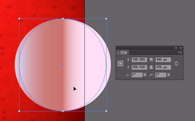 4、绘制一个椭圆。大小为495x476的椭圆。填充线性渐变色①#dbcfe9②在位置50.5%:#cb746d③#fee0f5;在窗口找到变换。或按shift+f8;ctrl+c,ctrl+f复制一层在上面。更改宽度为448px;颜色更改为①50%的位置#ffffff②50.5%的位置:#f0d1d1;