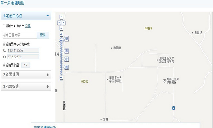 第一步:进入百度创建地图的网站http://api.map.baidu.com/lbsapi/creatmap/,搜索出自己要展示的位置,如下图所示。
