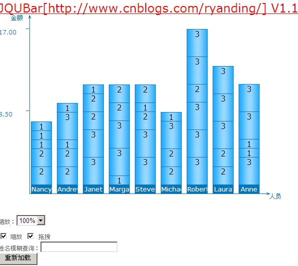 显示JQUBAR插件页面的html标准请使用 <!DOCTYPE HTML PUBLIC "-//W3C//DTD HTML 4.0 Transitional//EN"> ,MVC2.0 C#代码使用NORTHWIND数据库。JQUBar1.1插件在这里下载。