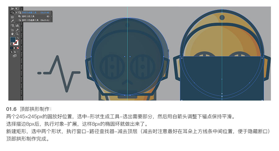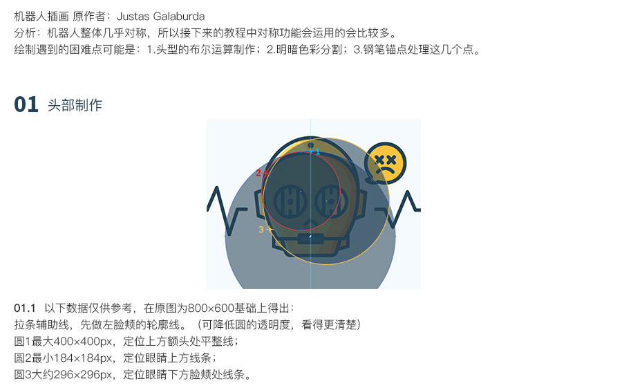 教你使用AI绘制对称的机器人插画,绘制遇到的困难点可能是:1.头型的布尔算法制作;2.明暗色彩分割;3.钢笔描点处理这几个点,好了,话不多说,下面让我们开始绘制之路吧