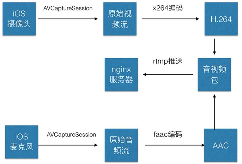② 对视频进行H264编码,对音频进行AAC编码,在iOS中分别有已经封装好的编码库(x264编码、faac编码、ffmpeg编码)来实现对音视频的编码。