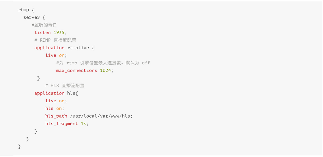 查找到nginx.conf配置文件(路径/usr/local/etc/nginx/nginx.conf),配置RTMP、HLS。