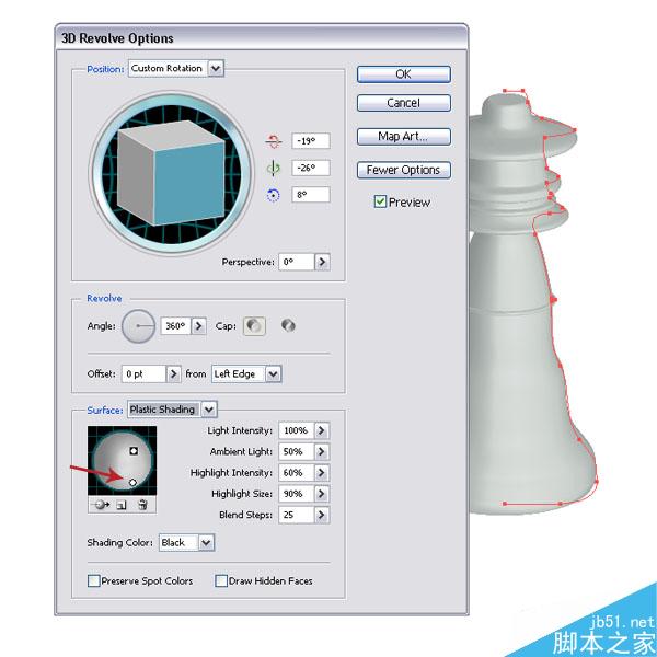 3.选中形状,执行效果菜单>3D>绕转。应用如图设置。点击新建光源添加另一个高光。然后点击确定。