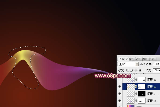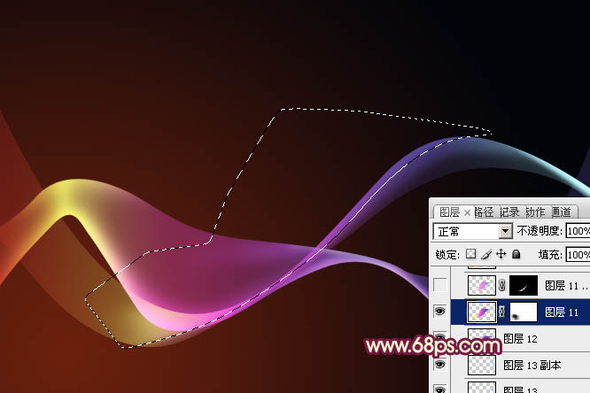 6、用钢笔勾出下图所示的选区,羽化5个像素后按Ctrl + J 把选区部分的色块复制到新的图层,不透明度改为:100%,添加图层蒙版,用黑色画笔把边缘的过渡擦出来,如下图。
