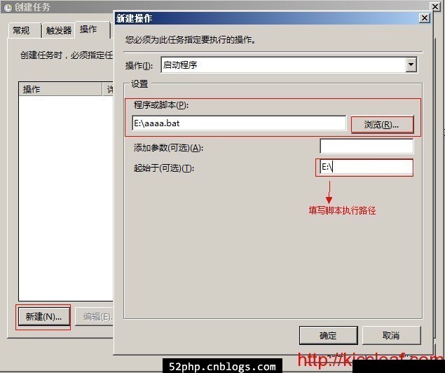 4、再来配置需要执行的“操作”,就是选择所写的程序或是BAT文件,这里很重要的配置是选择BAT文件后,在“起始于(可选)”这里一定要填写相应执行程序或是BAT文件的所在目录,要不然是执行不成功的。