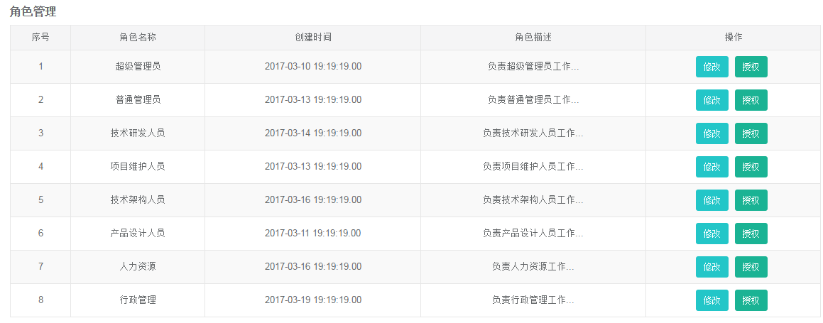 给角色分配权限中,操作栏中有两个按钮:修改和授权