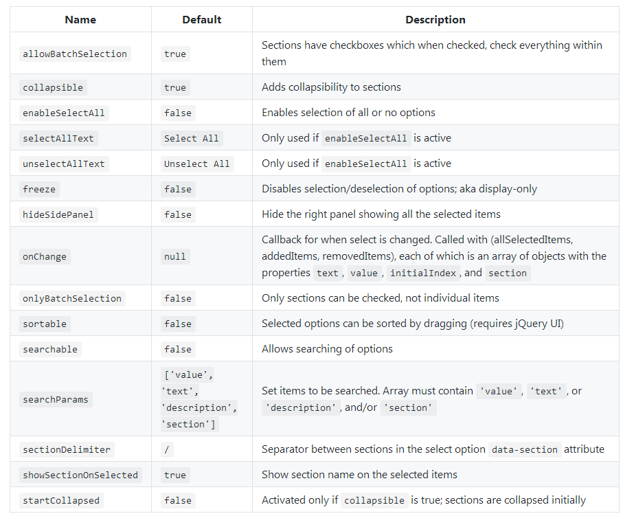 其中参数:searchable、collapsible、hideSidePanel、onChange、startCollapsed较为常用和重要,其他参数用户可以根据自己需求添加。