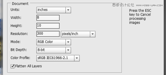 上面的对话框是中间部分是文档设置。默认情况下,单位为英寸,宽度和高度为8×10。