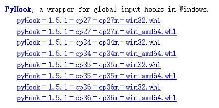 我是 win10 64 位 python 2.7,用的是第二个,下载之后用解压软件打开,把 pyHook放到C:\Python27\Lib\site-packages\pyHook下即可。