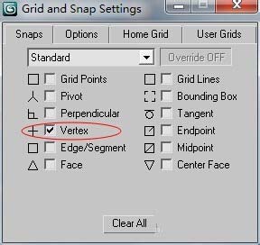 5、按S键将捕捉打开,捕捉模式采用2.5维捕捉,将鼠标光标放在按钮上方,单击鼠标右键,在弹出的【Grid and Snap Settings】(栅格和捕捉设置)窗口中,勾选【Vertex】(顶点)复选框。