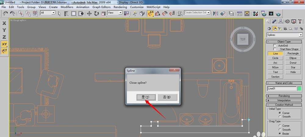 6、单击(创建)/(线形)Line(线)按钮,在顶视图中绘制墙体内封闭线形。