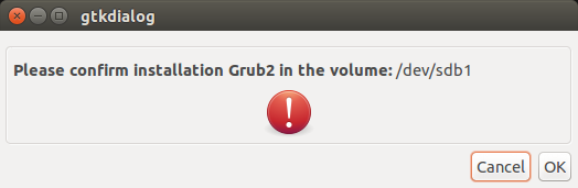 那么,拔出/重新插入USB,再次运行MultiSystem。选择USB盘,再次点击确认。现在,你被要求确认在USB中安装Grub2.点击OK继续。