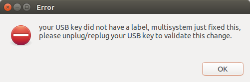 选择USB设备,点击确认按钮。如果你看到下面的错误窗口,不必担心,它说的是USB设备没有标签。点击OK让MultiSystem自动设置标签。