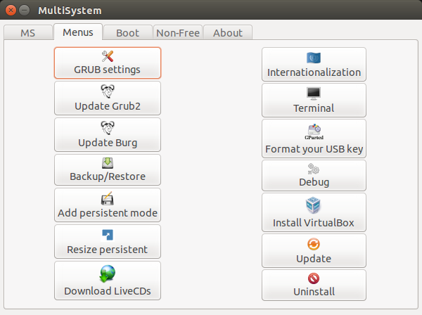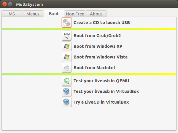 MultiSystem工具是我测试到现在最棒和最有用的一款工具。这款工具对那些想要在他们的机器上安装多个系统的人是非常有用的。在你外出的时候,你不必再携带CD/DVD袋了。只要买一个16GB或者32GB的USB就行,并下载所有你想要的系统,随心所欲的安装系统即可。