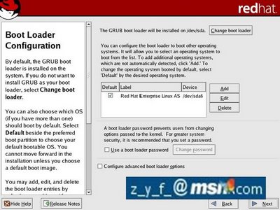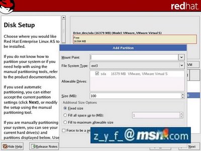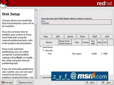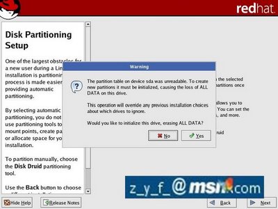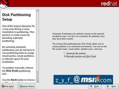 系统的分区选项,这里选手动分区"Manually partition with Disk Druid",因为我们要将Oracle安装在一个较大的分区内,如果自动分区的话,可能会出现空间不够的情况.