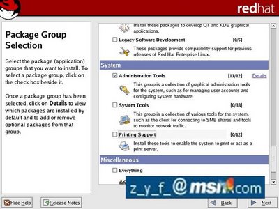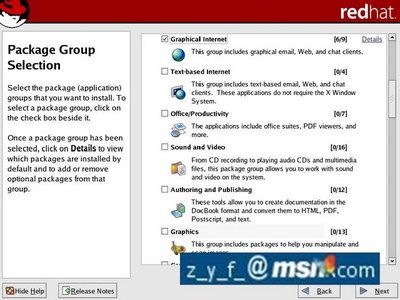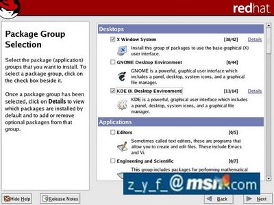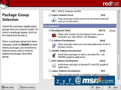 去掉"GNOME"选"KDE"这个除了个人喜好外,还有一点是如果有远程进行图文安装的话,KDE比较稳定,还有一点是软件开发工具要装,不然后面安装会重新安装组件,具体的软件包选择可以参考上面的图片.