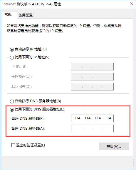 4、单击【使用下面的DNS服务器地址】,将DNS设置为“114.114.114.114”或“4.2.2.2” 点击确定-确定,保存即可。