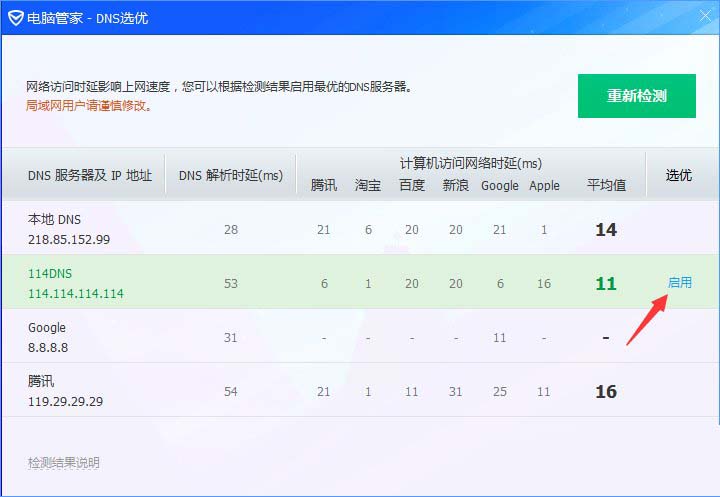 4、检测完毕后看哪个平均值低,鼠标移动到该DNS上,点击【启用】即可。