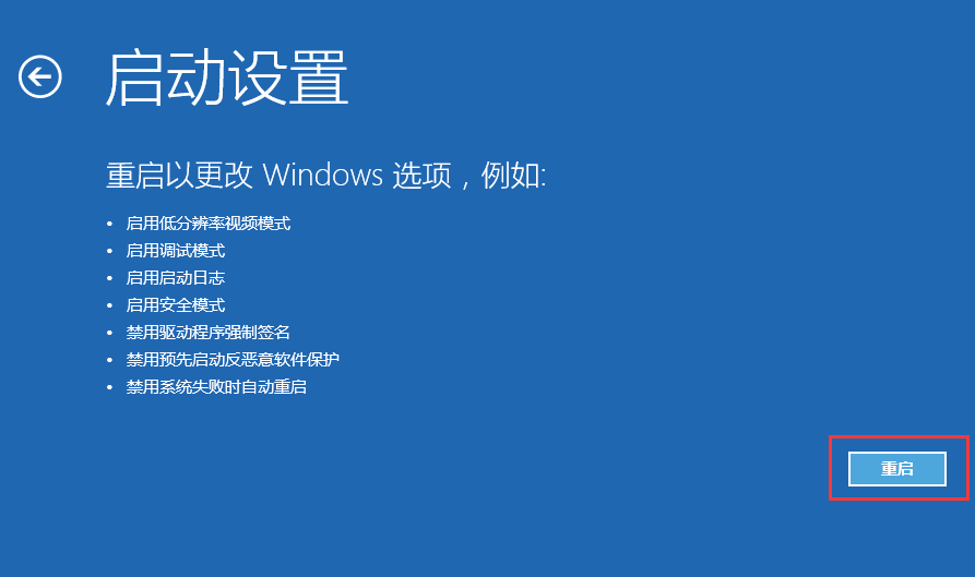 5、接下来在启动设置中,我们可以看到多选项(如禁用驱动程序强制签名),这时是不能选择的,Windows需要我们先重启来激活这些选项,我们点击重启即可