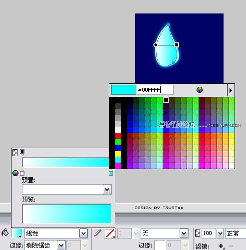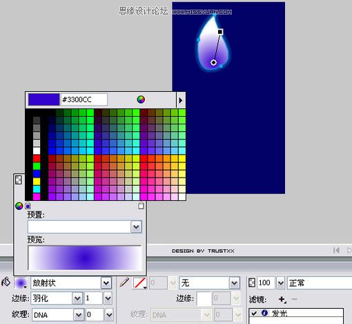 随意新建一个画布,填充背景色为#000066,钢笔勾出基本形状,羽化边框(半径1),填充放射性渐变,外加滤镜外发光,效果如图: