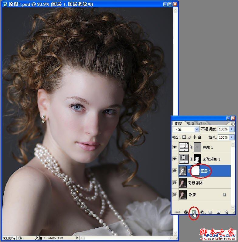 单击图层面板下部的“添加图层蒙版”按钮,为“图层1”增加一个蒙版