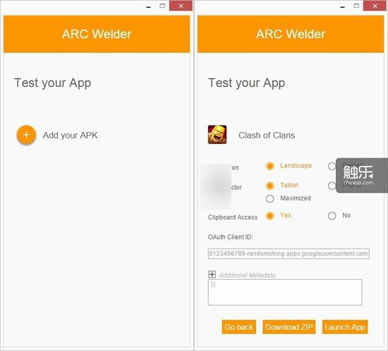 三、需要点击添加你的APK,然后选择APK文件,并点击开启。ARC Welder会询问你开启应用的方式(横屏或竖屏模式,手机或平板模式等等),选择完成后,点击运行应用按钮。
