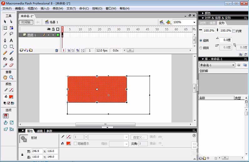 5、选中舞台中的图形,移动鼠标,当鼠标变成⇋时,可以变形成平形四边形,即是水平方向变化。