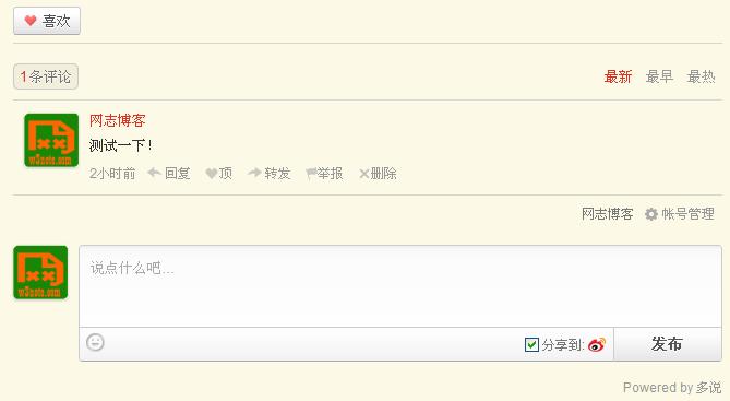 使用上面的方法,你可以把你的网站的评论模块去掉了,当然,多说评论插件的功能决不止于此,剩下的留作以后慢慢讨论吧。