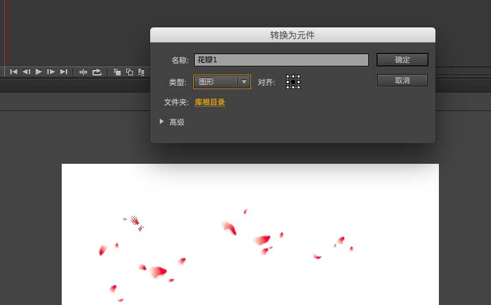 5、然后选中一些花瓣,最好细小一点,这样之后制作会更真实,按F8,转化为图形元件,命名为花瓣1