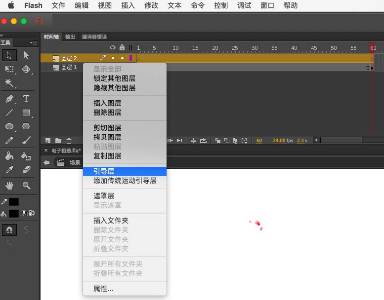7、在第一层我们将花瓣1拖进来,在第60帧处打上关键帧,新建一个图层右击转换成引导层
