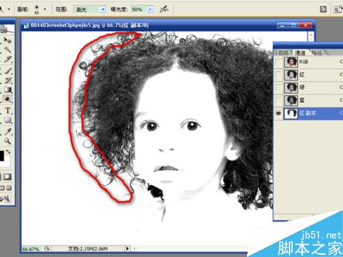 选择“减淡工具”,选择“高光”,降低不透明度。将背景变成白色。在涂抹到头发时,会将细小的头发丝去掉。保留头发丝,就需要降低更多的透明度,或是用加深工具的阴影先加强一下头发丝。