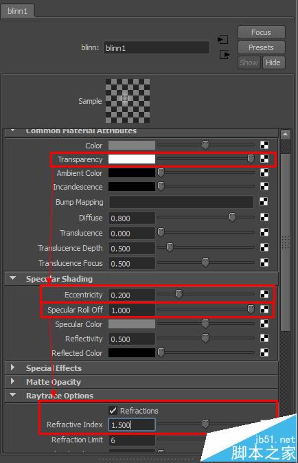 4、调节此Blin材质,透明度、反光、折射参数,如图: