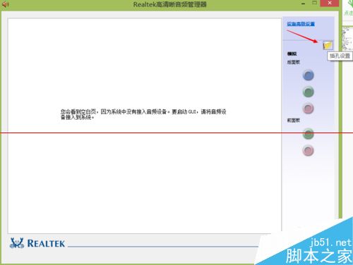 4、点击“realtek高清晰音频管理器选项”,进入realtek高清晰音频管理器界面,会出现“您会看到空白页,因为系统中没有接入音频设备。要启动GUI,请酱音频设备接入到系统。”提示,