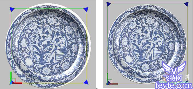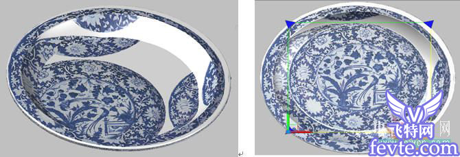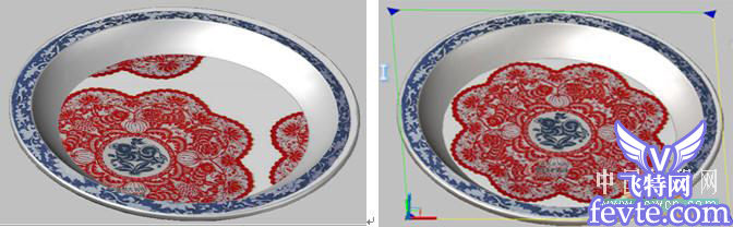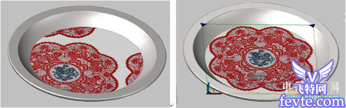 这样设置后,就可对盘子赋给材质(图片)了,但是赋给整个三维体的材质,有时并不如意,这里的盘子被赋给图片后,图形是零乱的(如插图3左所示),这就需要调整图位了。