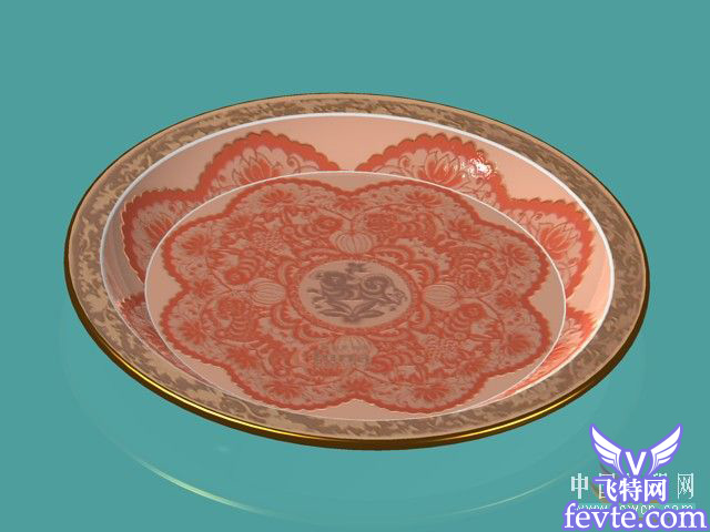 其它材质的参数同前,这样设置后,再执行渲染命令,就渲染为赭色压花瓷盘了,如下图所示: