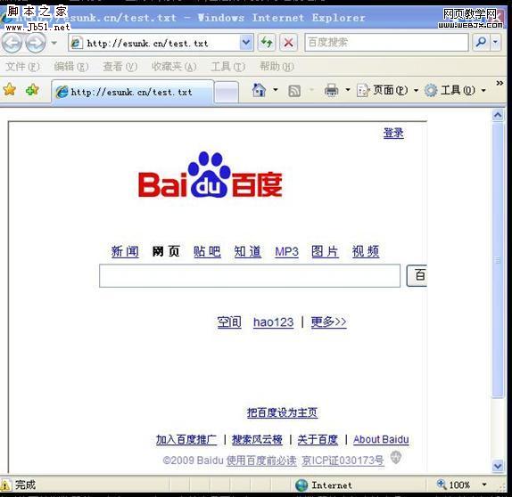 然后把test.txt上传到web空间中,访问一下,在框架中打开了百度.