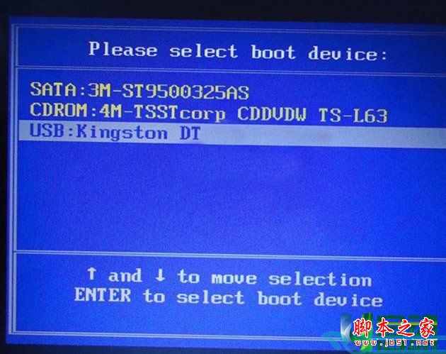当我们连续按下快捷键ESC后,电脑会自动进入一个启动项选择的界面,现在我们需要通过键盘上的上下方向键将光标移至开头显示为“usb”的选项后按回车键确认即可;如下图所示: